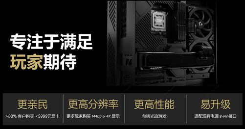 聊完RDNA4和FSR4后,锐龙CPU及Radeon显卡高级总监王岚志带来了更为细致的新品讲解。AMD通过调查数据发现,大于88%的用户会购买价格低于5999元的显卡,并且更多玩家会购买1440P-4K的显示设备,这些玩家还想要更高的性能,能够运行光追游戏的同时还要易于升级,最好适配现有的8-pin电源接口。而作为专注于满足玩家期待的品牌,AMD当然不会辜负玩家的期待。