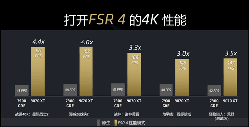 随后王岚志先生以RX7900GRE作为参照物,分别对比了AMDRadeon™RX9070XT和RX9070,RX9070相比RX7900GRE性能提升了20%以上,RX9070XT相比RX7900GRE性能提升至高达42%,而在支持FSR4的游戏上帧数更是提高了至多4.4倍。