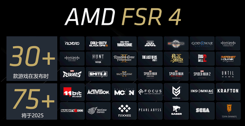 除了硬件架构上的提升外,AMD还着手软件优化,通过AMDHYPR-RX以及AMDFSR共同为玩家带来高速流畅的游戏体验。以FSR为例,最早可追溯到2021年,AMD在FSR上提出了空间超分辨率这个概念,随后通过经年累月的升级,在FSR2上增加了时间超分辨率,在FSR3时期增加了帧生成技术,在FSR3.1上提出了画质改进和可升级API,而随着RDNA4一起登场的FSR4通过基于ML的超分辨率技术,带来了高质量、低延迟的游戏体验,作为完全在AMD平台上开发、训练和优化出来的FSR4,采用了可升级的API框架,支持FSR3.1的游戏可以直接升级到FSR4,有效节省开发者的时间。目前FSR4已有30款以上的游戏支持,在2025年将逐步增加到75款游戏及工作室。