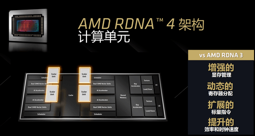 AMDGPU技术与工程研发高级副总裁DavidWang随后以AMDRadeon™RX9000系列产品为核心对RDNA4架构进行了深度的剖析。首先在计算单元方面,RDNA4架构对比RDNA3架构来说,拥有增强的显存管理、动态的寄存器分配、扩展的标量指令以及更高的效率和时钟速度。RDNA4架构还重构了光线追踪加速器,相比RDNA3带来了两倍的光线交叉引擎、全新的光线变化引擎以及全新的定向包围盒,通过双倍的光线交叉引擎以及先进的光追技术,RDNA4相比RDNA3每计算单元光追性能翻了一倍。而在加速机器学习方面,RDNA4上新的FP8计算格式带来了更强大的运算性能,使其全面胜于RDNA3架构。